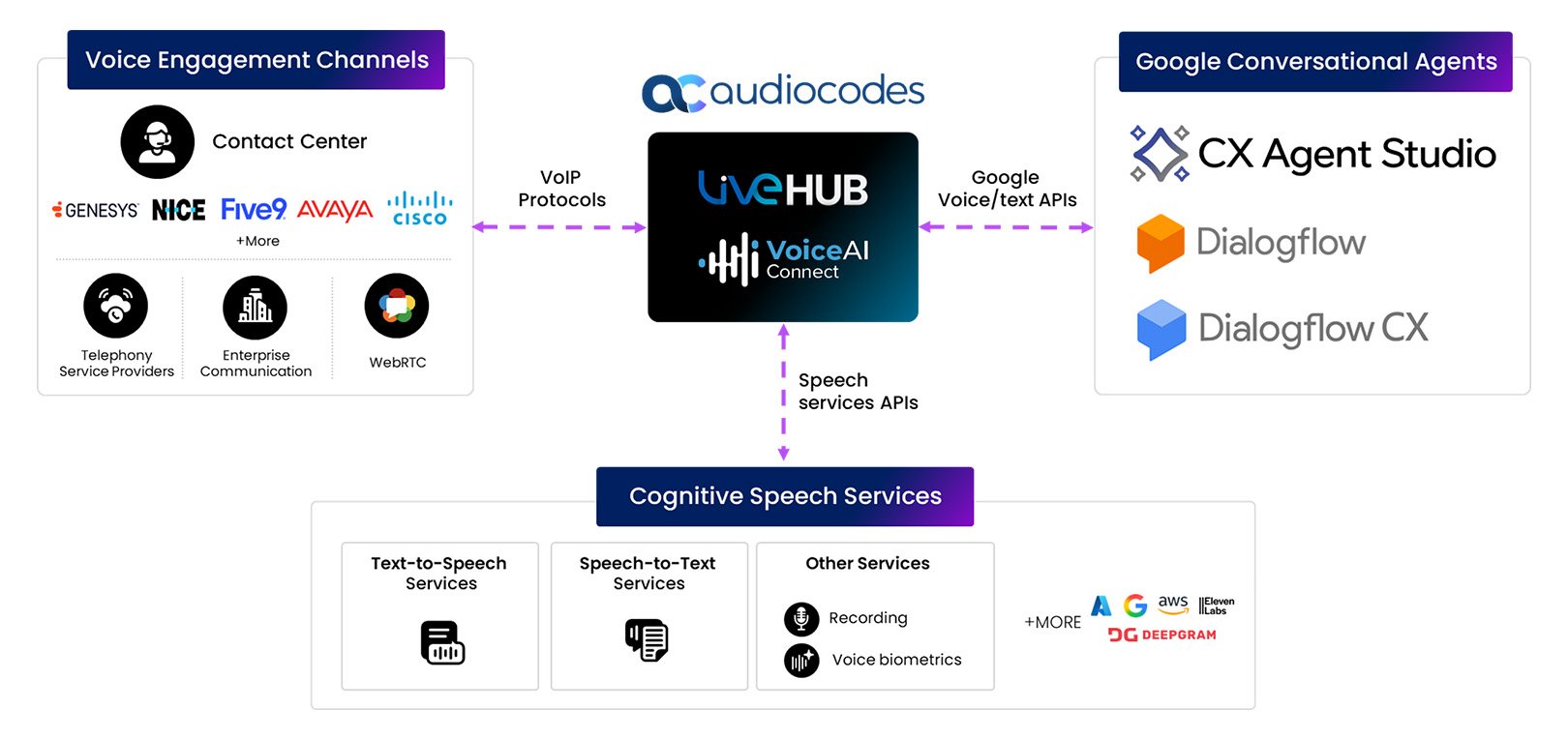 Google provides multiple conversational agent frameworks for customer experience. AudioCodes VoiceAI Connect and Live Hub integrate these agents with real-world voice channels telephony infrastructure, enabling rapid deployment of voice experiences without changes to existing voice environments. Google users can enjoy a seamless telephony-to-bot connection, instantly upgrading their bot with an additional telephony channel for a more automated, yet natural, conversational experience.